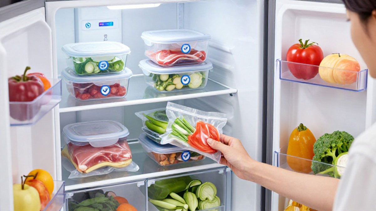 Pilih wadah kedap udara atau kantong plastik khusus freezer. Pastikan kemasan rapat dan tidak ada celah yang memungkinkan udara masuk. Untuk bahan makanan yang berukuran besar, gunakan plastik wrap tambahan sebelum dimasukkan ke kantong freezer.